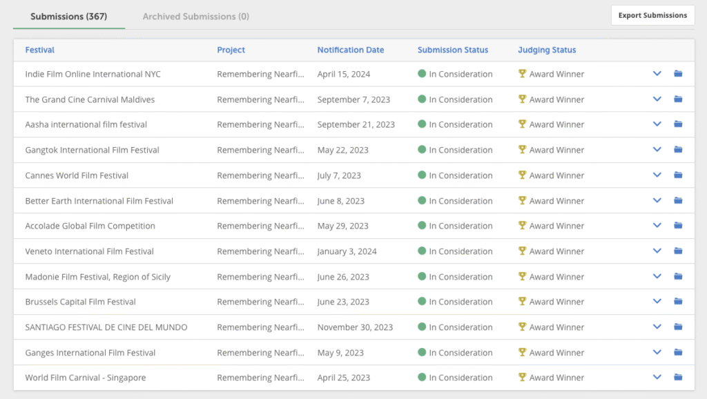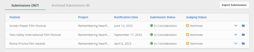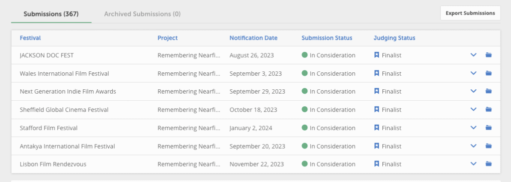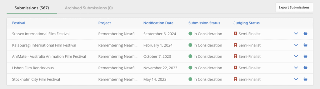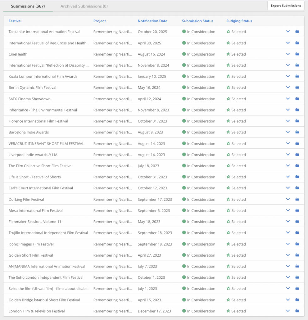 FilmFreeway also records the Semi-Finalist Selections relating to the film: