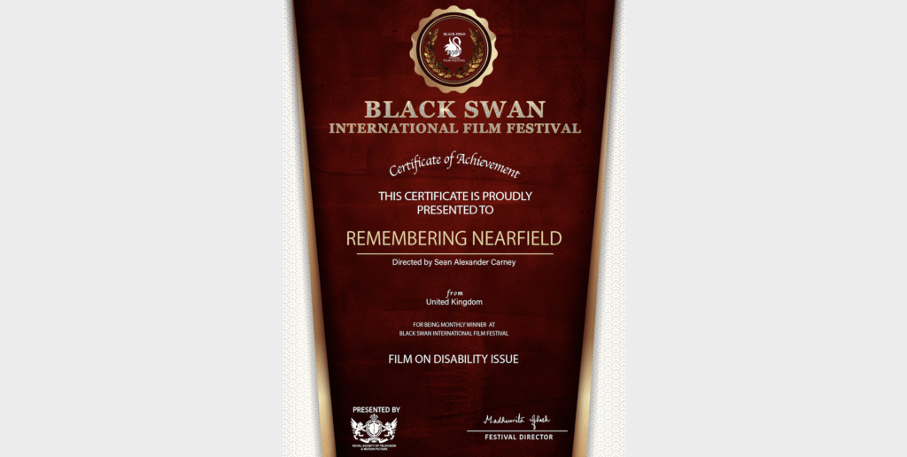 In 2023, the Black Swan International Film Festival awarded Remembering Nearfield Best Film on a Disability Issue, though has moved from FilmFreeway to another platform, and the festival website doesn’t mention it now, listing only awards from 2024. The certificate is shown above. In 2024 the same festival awarded the film with the “Patron of Cinema” award, as listed on IMDB.